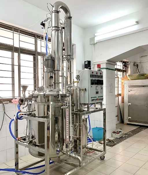 化学生命科学部の3・4年生を対象にした研究開発および実習、ならびに留学生との(オンラインと対面を組み合わせた)ブレンデッド・ラーニングと交流で使う、パイロット規模(100L/回)の蒸留と組み合わせた非加熱技術の統合システム