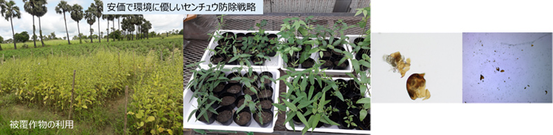 輪作は、ゴマや豆類の生産にとって経済的に重要な害虫であるハトマメセンチュウやネコブセンチュウのような植物寄生センチュウへの対策として重要です。しかし、イネと輪作していないゴマ圃場でシストセンチュウを防除するには、緑肥の利用が重要な対策になります。私たちの観察では、土壌にキマメ、ササゲ、グリーングラム、ブラックグラム、ヒマワリ、マリーゴールドを混ぜて栽培した場合、センチュウ密度が低下することがわかりました。またセンチュウ密度が最も低下したのは、マリーゴールドを2カ月栽培してから組み入れた時でした。