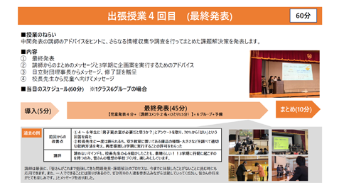 本プログラムの出張授業の特徴は、プログラム期間中、継続的に実施することです。児童の学習への「動機づけ」から「課題設定」のサポーターとして、また「中間発表」「最終発表」における外部評価者として、計4回、講師が関わることで、児童の主体的な探究を後押しします。