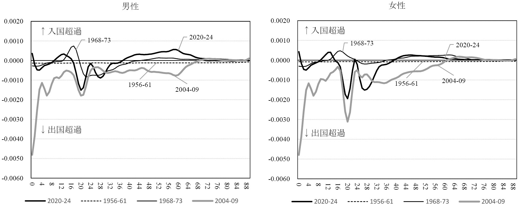 1990年代以降には,出国超過のピーク年齢の若年化,及び20-50代全般における出国超過傾向の強まりが見られた。これは海外駐在だけではなく,留学の増加など海外移住機会の多様化によるものと考えられるが,そのパターンは男女で少し異なる。男性の場合,日本企業の海外展開が本格化するにつれ,海外駐在のタイミングが30代以降,50代位まで拡大していく。一方,女性の場合,出国超過傾向は留学のタイミングと思われる10代後半から20代前半にかけて強まり,代わって30代以降は入国超過傾向が強まった。これは留学とその後の帰国に対応したものと考えられる。
