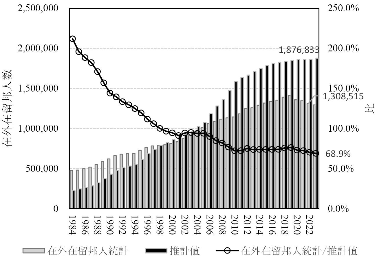 また,本推定と「海外在留邦人数調査統計」の値から求められる在留届の提出率は2000年代以降だと約7-9割台であり,また時代とともに低下する傾向が見られることから,本推定はおおむね妥当といえる。なお,1980年代から2000年代にかけて「海外在留邦人数調査統計」が推定値を上回っているが,これは本推定が1956年以降の移住を対象にしており,戦前に移住した人たちを含んでいないことによる差と考えられる。実際,1984年時点での推定値と実績値の差は,「海外在留邦人数調査統計」に含まれる海外在留邦人の内,戦前から現地で暮らしてきたと考えられる「永住者」の人口規模にほぼ等しい。この差は戦前に移住した人たちが,戦後,南米の日系人のように,日本への帰国が進む中で次第に縮み,2000年代に入るまでにほぼ消滅した。