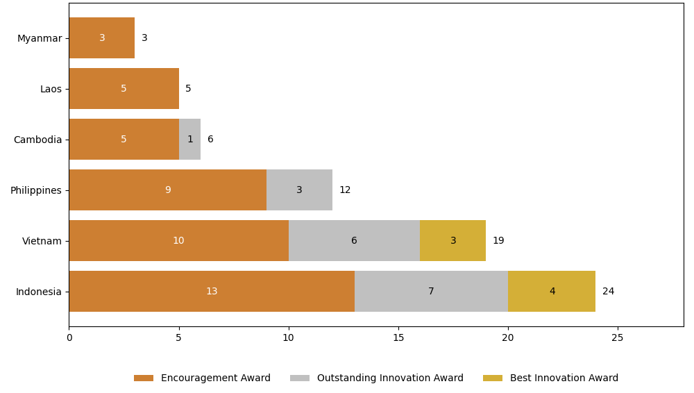 Over the five years from FY2020 to FY2024, the Award covered six countries and 41 institutions, recognizing a total of 69 achievements (7 Best Innovation Awards, 18 Outstanding Innovation Awards, and 44 Encouragement Awards). Annual award numbers ranged between 12 and 16, with limited year‑to‑year variation. By country, Indonesia had the highest number of award recipients, followed by Vietnam and the Philippines. Best Innovation Awards were primarily concentrated in Indonesia and Vietnam. (Figures 1 and 2)