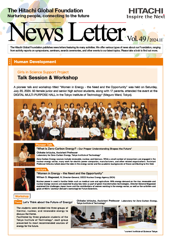 The Hitachi Global Foundation publishes news letters featuring its many activities. We offer various types of news about our Foundation, ranging from activity reports on symposiums, seminars, awards ceremonies, and other events to our latest topics. Please take a look to find out more.