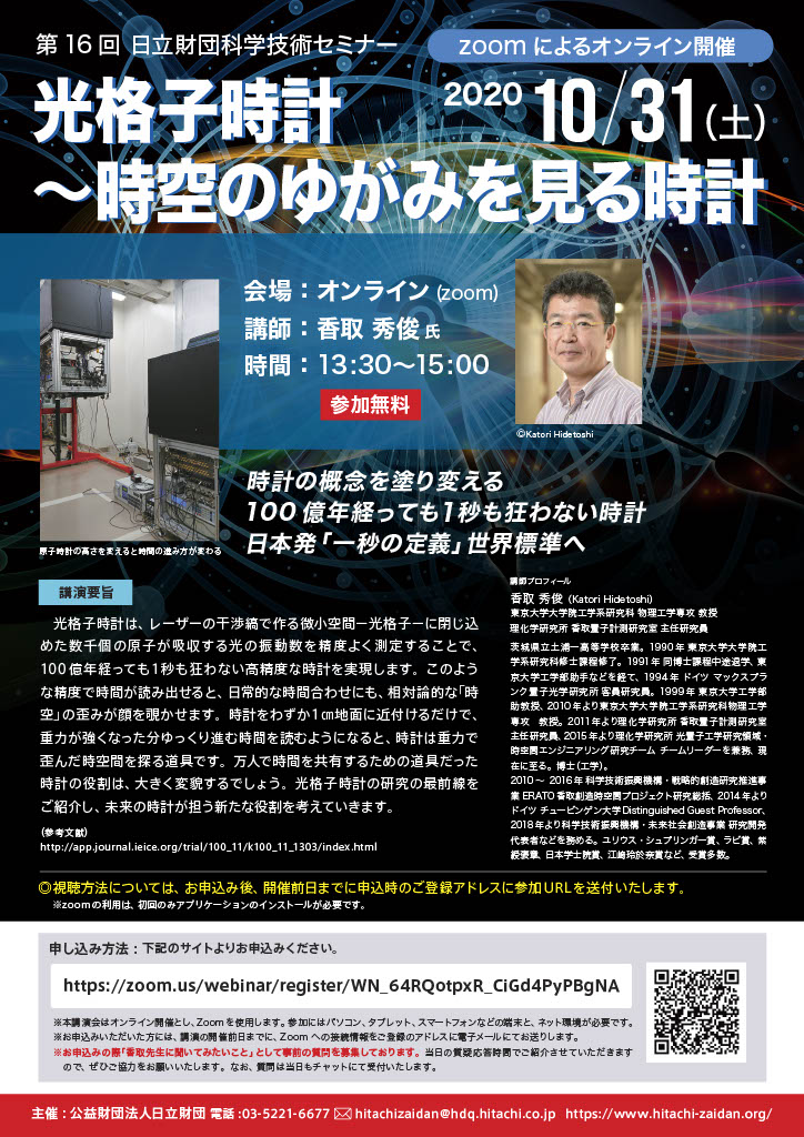 今回の科学技術セミナーは、量子エレクトロニクスの分野で原子時計の研究をされている香取 秀俊氏(東京大学大学院工学系研究科物理工学専攻 教授、理化学研究所香取量子計測研究室 主任研究員)を講師にむかえ、日本発の最先端研究に迫ります。